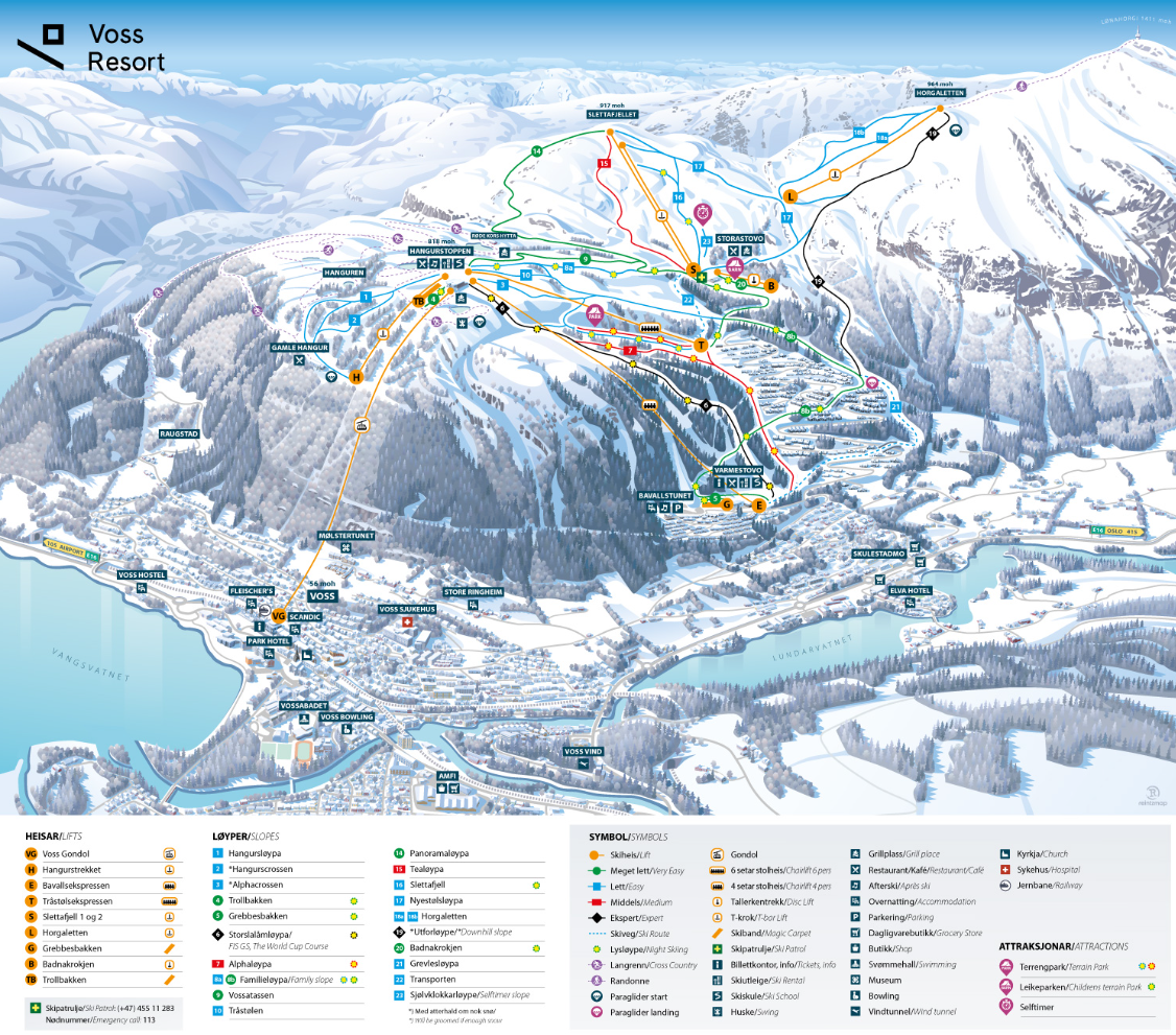 Sjå Voss resort sine sider for høgoppløyst kart. Her kan du sjå at startar og landingar er merka på kartet.